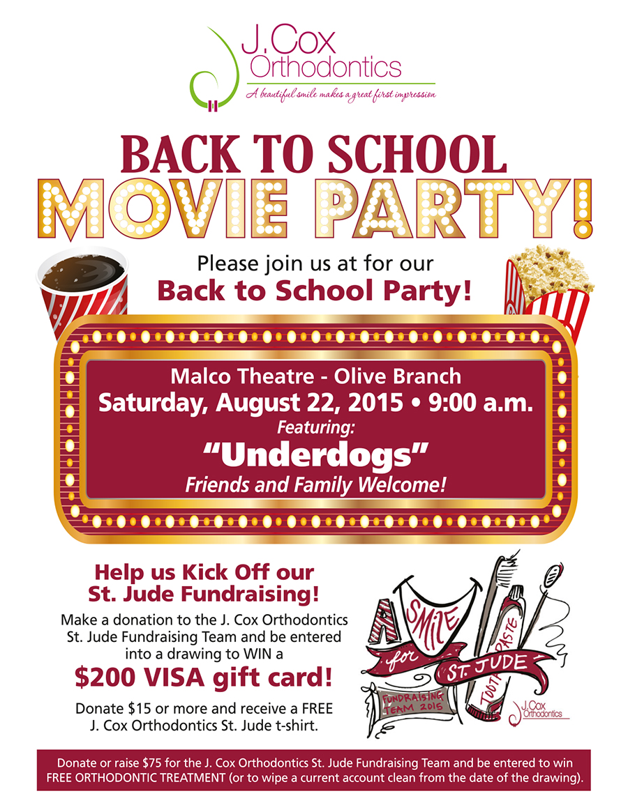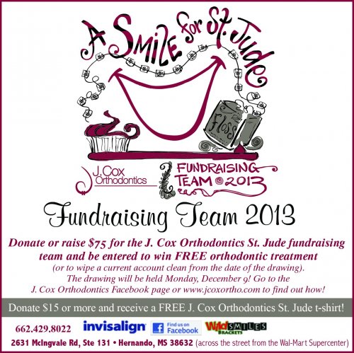 Donate or raise $75 for the J. Cox Orthodontics St. Jude fundraising team and be entered to win FREE orthodontic treatment (or to wipe a current account clean from the date of the drawing). The drawing will be held Monday, December 9! Donate $15 or more and receive a FREE J. Cox Orthodontics St. Jude t-shirt!Go to the following link to find out how to make donations or YOU MAY STOP BY OUR OFFICE TO MAKE DONATIONS!