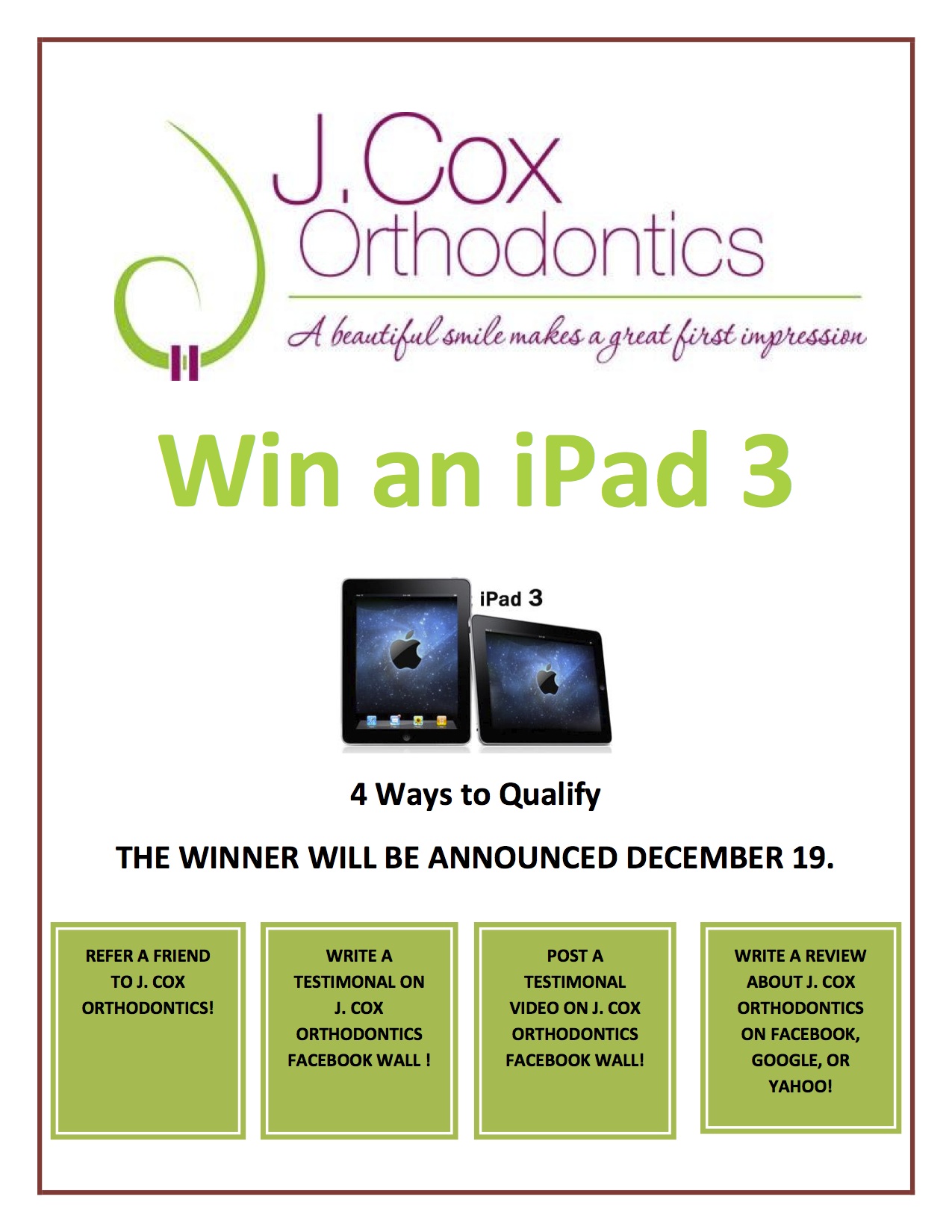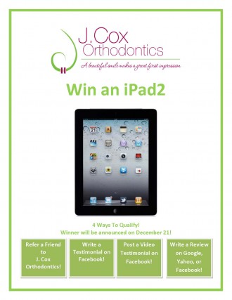 A Smile for St. Jude!! Donate or raise $75 for the J. Cox Orthodontics St. Jude fundraising team and be entered to win FREE Orthodontic treatment (or wipe a current account clean from the date of the drawing). The drawing will be held on Monday, December 7th. You can copy and paste the link below to find out how.